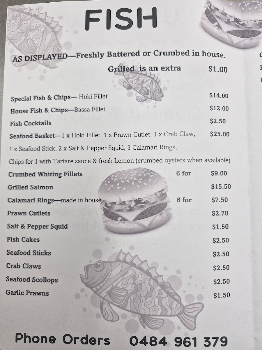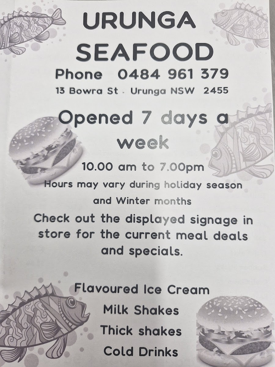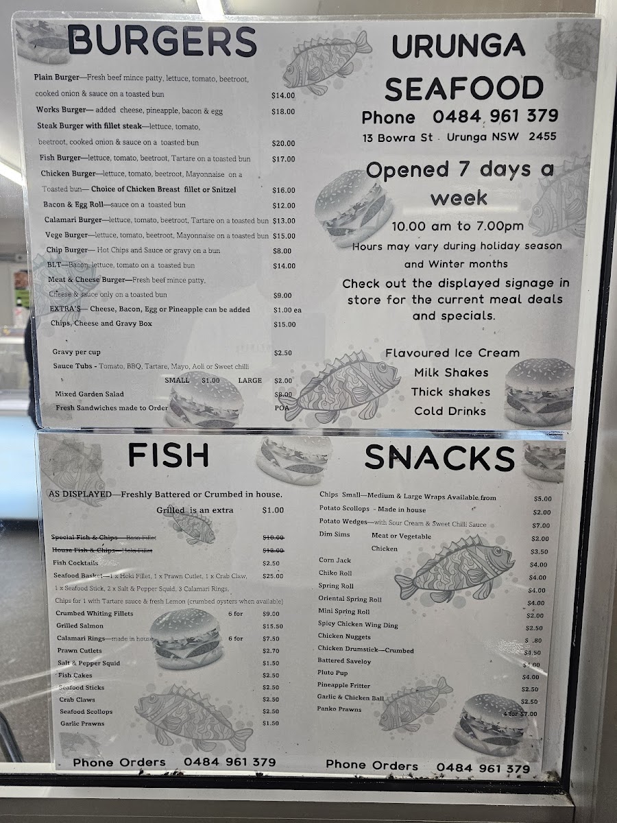 The menu at Urunga Seafood & Takeaway offers a straightforward selection of casual, comforting dishes perfect for a relaxed meal close to the water. With a focus on classic fish and chips alongside hearty chicken and burger options, it caters well to those looking for satisfying, familiar flavors without fuss.